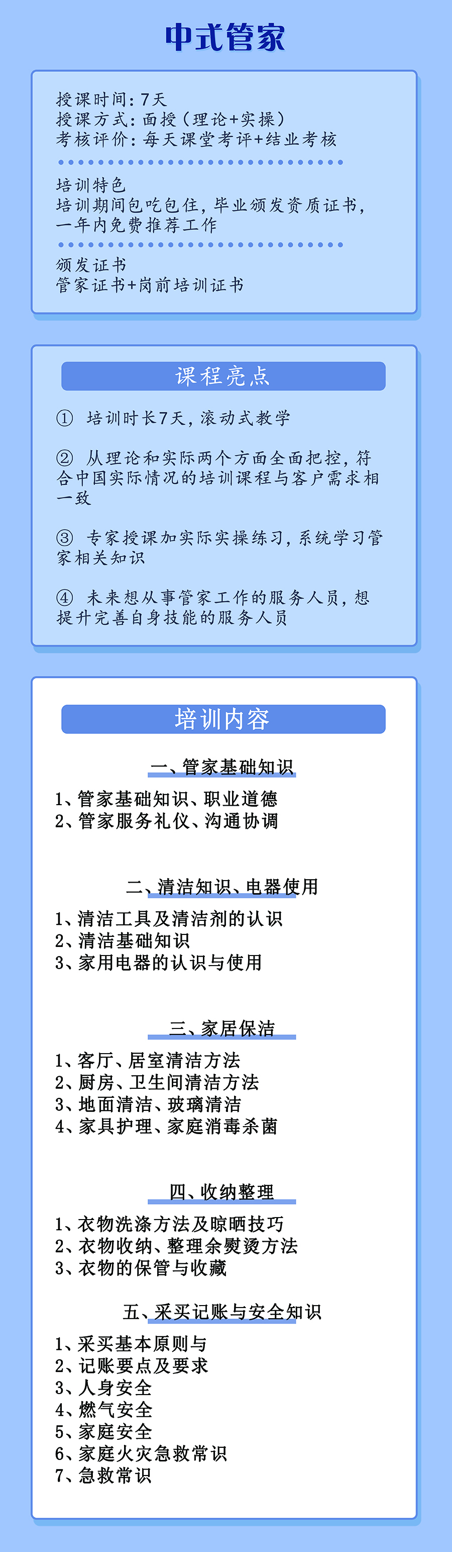 1、0基础想进入家政服务行业的人群;3、想提升完善自身技能的服务人员;2、未来想从事管家工作的服务人员;